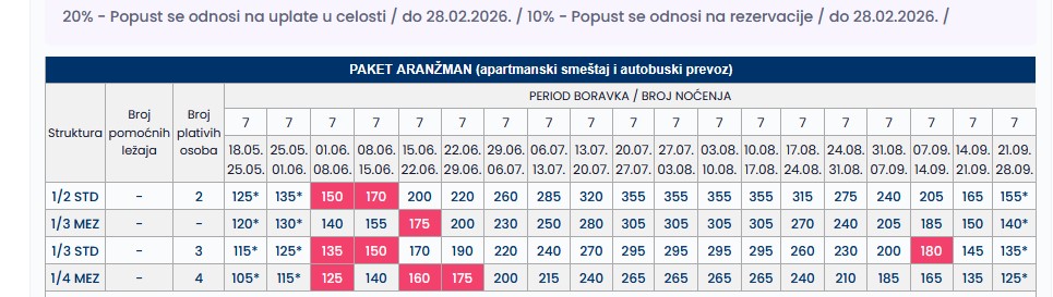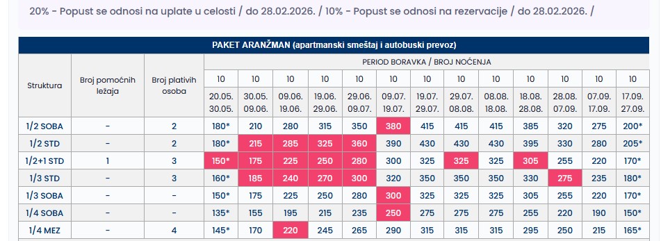 • u slučaju sopstvenog prevoza, cena paket aranžmana se umanjuje za 30 € po plativoj osobi