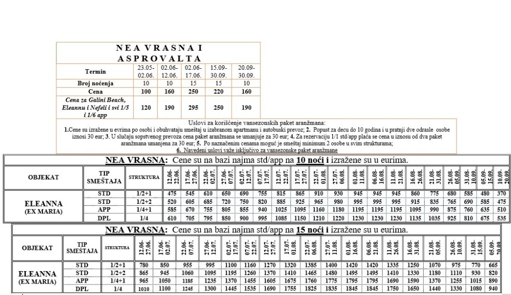 Vila Eleanna (ex Maria) je najatraktivnija kuća u Nea Vrasni, smeštena na samoj plaži i u centralnom delu mesta. Kuća raspolaže sa 1/2+1 studijima sa francuskim ležajem (140 cm) i pomoćnim krevetom (kocka koja se razvlačenjem formira u udoban ležaj). 1/2+2 studiji su sa francuskim ležajem (140 cm) i dva pomoćna ležaja (kocka na razvlačenje i žičani pomoćni krevet). Većina 1/2+2 studija ima direktan pogled na more. Dupleks apartmani 1/4 su troprostorni i imaju po dva ležaja u svakoj sobi iz kojih se izlazi na terasu i sa kojih se pruža direktan pogled na more. Kuhinje su opremljene velikim kombinovanim frižiderom, dve plotne sa rernom i trpezarijskim stolom i stolicama. Klima uređaj i TV se nalaze u jednoj od dve spavaće sobe dupleks apartmana. Apartman 1/4+1 je dvoprostoran sa francuskim krevetom u spavaćoj sobi i sofom i foteljom na razvlačenje u prostranoj dnevnoj sobi. U istoj prostoriji se nalazi kuhinja opremljena identično kao u drugim jedinicama. Ovaj apartman raspolaže nešto užom terasom i pogledom ka brdu. Sve smeštajne jedinice su sa klima uređajem (doplata za klimu je 10 eur dnevno/ po smeštajnoj jedinici od 01.07 – 31.08), sa TWC-om i TV-om. Od 2018. kompletno su renovirana kupatila, opremljena luksuznim pločicama i sanitarijama. Sve smeštajne jedinice poseduju peškire. Moguće je parkirati vozilo iako ne postoji obezbeđen parking prostor. Vila (ne i svaka smeštajna jedinica posebno) poseduje sopstveni bežični internet sa jednim ruterom pa u skladu sa tim ne možemo garantovati jačinu signala. Napomena: U blizini vile se nalazi bar na otvorenom Kyklades, pa se za vreme visoke sezone može desiti da bude glasnija muzika po noći ( pogotovo za vreme grčkih praznika).
