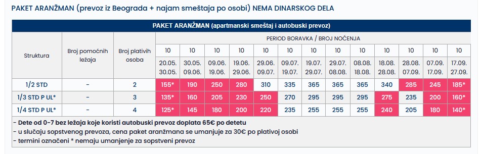 • u slučaju sopstvenog prevoza, cena paket aranžmana se umanjuje za 30 € po plativoj osobi