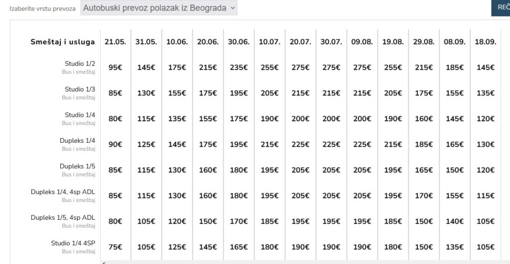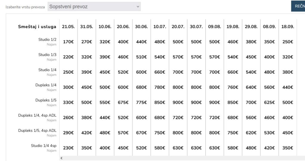Ova četvorospratna vila raspolaže različitim smeštajnim jedinicama: dvokrevetnim, trokrevetnim i četvorokrevetnim studijima, četvorokrevetnim i petokrevetnim dupleksima. Studiji kao i dupleksi sadrže standardno opremljenu čajnu kuhinju, kupatilo, TV i klima uređaj. Klima uređaj se dodatno doplaćuje na licu mesta (7-10€ po danu). Smeštajne jedinice su raspoređene u prizemlju, na prvom, drugom, trećem i četvrtom spratu.