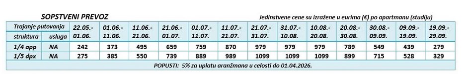 - – za uplatu do 01.04.2026. popusti zavise od izabrane smene, objekta i načina prevoza. Uz svaku tabelu sa cenama naznačeni su i iznosi popusta.