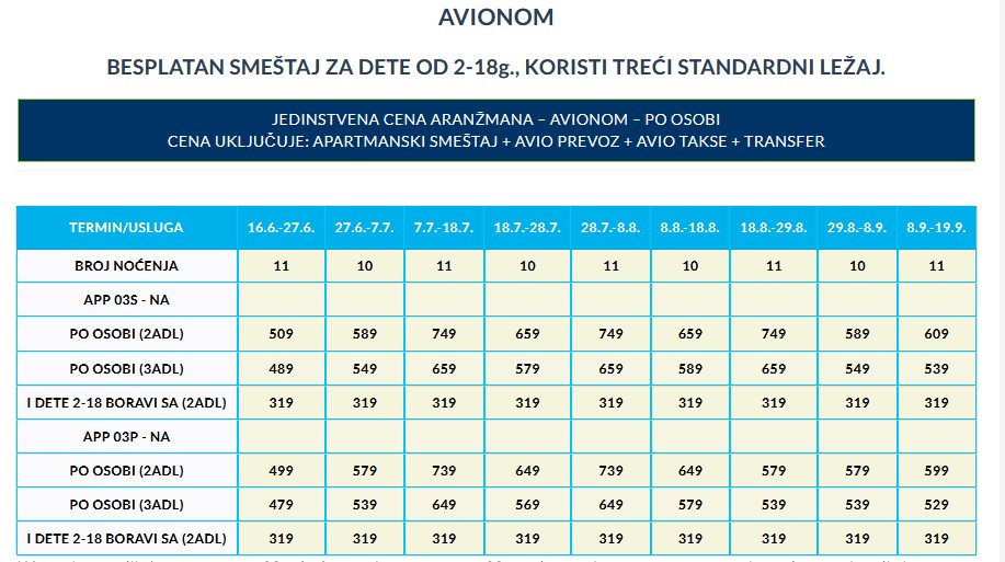 PROGRAM PUTOVANJA: Dan polaska – poletanja aviona je datum iz tabele. Prvi dan: sastanak putnika dva i po sata pre poletanja kod šaltera za čekiranje na beogradskom aerodromu “Nikola Tesla”. Obavezno jedan dan pre putovanja proveriti tačno vreme i mesto sastanka putnika i poletanja aviona. 2-10/11.dan: boravak u izabranom terminu i objektu sa izabranim uslugama. 11/12.dan (poslednji dan boravka): napuštanje objekta, poletanje iz Preveze prema planu letenja. Sletanje u Beograd. Kraj usluga.