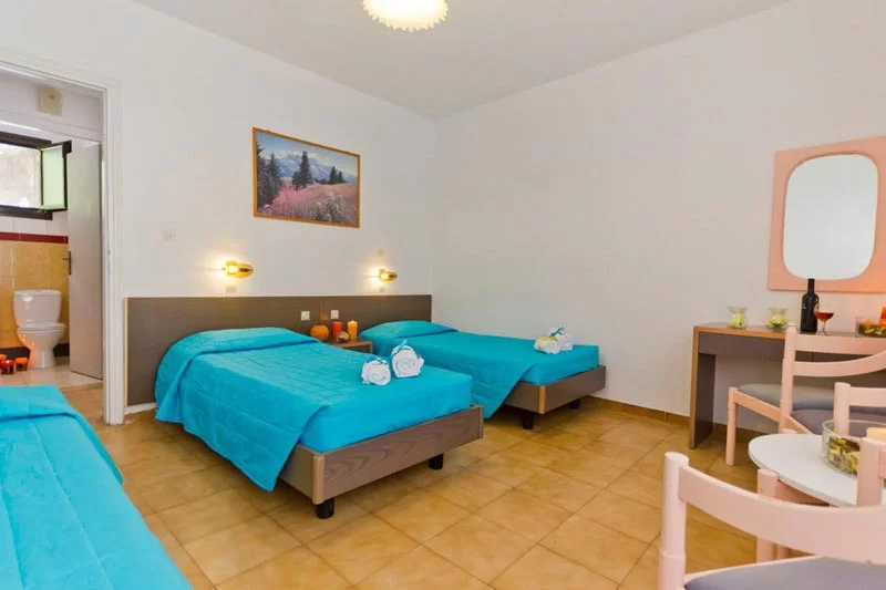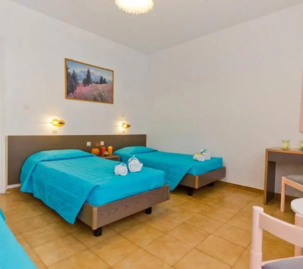 Apartman 03: apartmani se nalaze u prizemlju i na spratu. Svaki apartman se sastoji od jedne sobe sa širokim (francuskim) ležajem i dodatnim standardnim ležajem ili tri odvojena ležaja, kuhinjskog dela (veliki frižider, šporet sa dve ringle, električni bokal, posuđe za odgovarajući broj osoba), kuhinjski sto za 4 osobe, wi-fi internet, klima, sef, fen, kupatilo sa peškirima. Terasa je ispred ulaza u apartman sa garniturom za sedenje, a spratni apartmani imaju terasu sa garniturom za sedenje na koju se izlazi iz sobe.