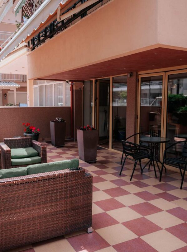 studijima, I dvokreventim, trokrevetnim I četvorokrevetnim apartmanima. U prizemlju vile se nalazi bar sa salonom i recepcija. Vila ne poseduje lift. Dvorište vile je veoma lepo uređeno sa garniturama za sedenje, koje gosti mogu da koriste. Preko puta same vile se nalazi super market “Mytikas”, a u neposerdnoj blizini su taverne, picerije, kafići, poslastičare, prodavnice… Vilu preporučujemo kako za porodice, tako i za veća društva. Doplata za klimu je 7 € po danu.