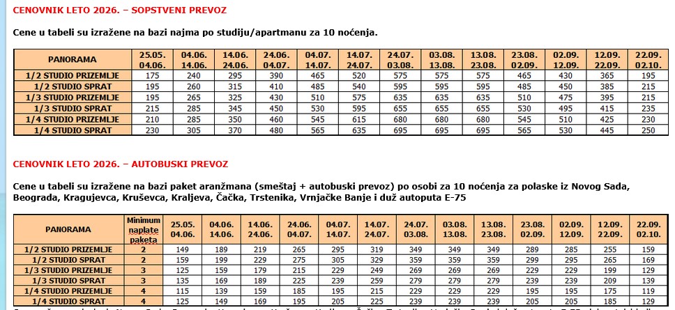 – Organizator zadržava pravo da putem LAST MINUTE ILI BILO KOJE VRSTE SPECIJALNE PONUDE proda svoje slobodne kapacitete po cenama koje su drugačije od onih u cenovniku. Stranke koje su uplatile aranžman po cenama objavljenim u ovom cenovniku nemaju pravo da potražuju nadoknadu na ime razlike u ceni.
