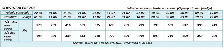 - Organizator zadržava pravo da putem Last minute ponude proda svoje slobodne kapacitete po cenama koje su drugačije od onih u cenovniku. Stranke koje su uplatile aranžman po cenama objavljenim u PROGRAMU PUTOVANJA nemaju pravo da potražuju nadoknadu na ime razlike u ceni. Takođe, Organizator putovanja zadržava pravo da za određene smene prodaje isključivo paket aranžman, bez mogućnosti umanjenja cene za sopstveni prevoz.