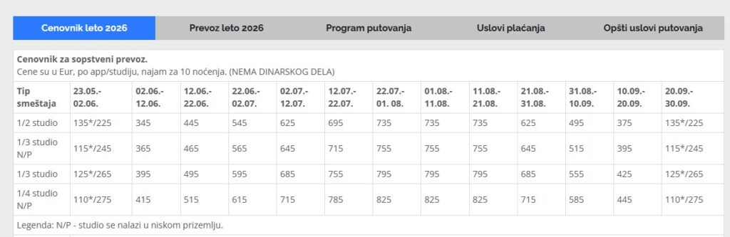 - • Početak korišćenja smeštajne jedinice (apartmana – studia) je posle 14:00 časova na dan dolaska, a napuštanje smeštajne jedinice (apartmana – studia) zadnjeg dana boravka najkasnije do 09:00 časova. Higijenu u apartmanima i studijima održavaju gosti, a posteljina se menja najmanje jednom u toku smene. Eventualne neispravnosti i nedostatke u smeštaju prijaviti odmah predstavniku agencije. Putnici su obavezni da prilikom ulaska u smeštaj, predaju 1 pasoš, koji će im biti vraćen na dan odlaska. Svaku pričinjenu štetu putnik je u obavezi da nadoknadi vlasniku objekta pre napuštanja smeštaja. Svaka oštećenje, koje je postojalo u smeštaju prilikom ulaska, a nije prijavljeno predstavniku, tretiraće se kao šteta, koju su pričinili putnici koji trenutno borave unutra.• Organizator zadržava pravo da putem FIRST MINUTE ili LAST MINUTE ponude proda svoje slobodne kapacitete po cenama koje su drugačije od onih u cenovniku. Stranke koje su uplatile aranžman po cenama objavljenim u ovom cenovniku nemaju pravo da potražuju nadoknadu na ime razlike u ceni.