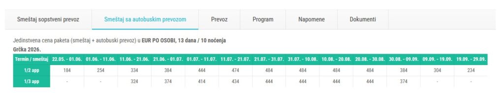 – ČEKOVI GRAĐANA: Akontacija 40% prilikom prijave/sklapanja ugovora, preostali iznos u jednakim mesečnim ratama bez kamate, zaključno sa 15.12.2026. Svaka rata dospeva 15-tog u mesecu. Garancija plaćanja rata, koje dospevaju nakon letovanja, su deponovani čekovi građana. Čekove deponovati najkasnije 15 dana pre polaska.