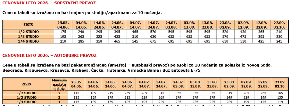 – Organizator zadržava pravo da putem LAST MINUTE ILI BILO KOJE VRSTE SPECIJALNE PONUDE proda svoje slobodne kapacitete po cenama koje su drugačije od onih u cenovniku. Stranke koje su uplatile aranžman po cenama objavljenim u ovom cenovniku nemaju pravo da potražuju nadoknadu na ime razlike u ceni.